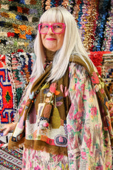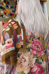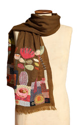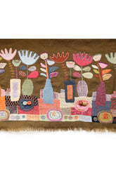 This piece of wearable art features features a still life scene including vases with flowers and fruit bowls against patchwork tablecloths - absolutely stunning. Appliqué, embroidery and crochet come together on a soft wool base. Sophie has been described as a master colourist, evident in the beautiful hand-dyed shades in this piece.