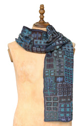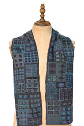 Rectangular shapes in deep shades of blue and green are patch-worked together in this moody unisex woo scarf. Sophie has been described as a master colourist, evident in the beautiful hand-dyed shades in this piece.