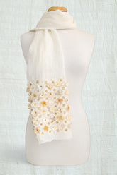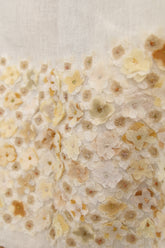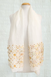 Layers of petalled flowers in shades of oat, sienna and daisy, decorate the hem of this fine linen scarf. Sophie has been described as a master colourist, evident in the beautiful hand-dyed shades in this piece.