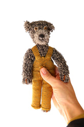Mees loves nothing more than to burrow down in front of the fire with a good book and his favourite cardigan. His brown fur is starting to shows signs of grey which he thinks makes him look dignified. Sophie has been described as a master colourist, evident in the beautiful hand-dyed shades in this piece.