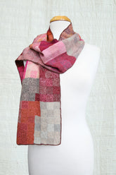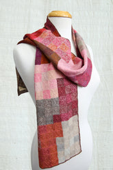 Like an artwork by Klimt this finely crocheted scarf features a pattern of squares in the subtlest of hues from fuchsia to chocolate. Sophie has been described as a master colourist, evident in the beautiful hand-dyed shades in this piece.