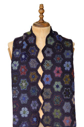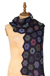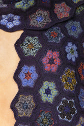 An intricately crocheted openwork scarf in fine wool, accented with velvet circles at the center of each motif in deep blues, rich reds, and soft lilac tones.The colours of this piece are so divine.
