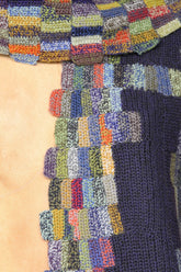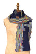 A lovely cosy wool scarf to keep you warm and cosy. With a small rectangles of various melange colours decorating the outer edges of this navy scarf, creating a jigsaw edge. Sophie has been described as a master colourist, evident in the beautiful hand-dyed shades in this piece.
