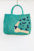 Small woven jute bag in aqua with leopard print motif on both sides and natural gusset.